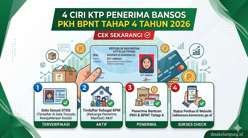Mengenali 4 ciri KTP penerima bansos PKH dan BPNT tahap 4 tahun 2026 sangat penting untuk memastikan kepesertaan sebelum pencairan dimulai. NIK terdaftar di DTKS, status sebagai KPM, KK yang valid, dan masuk kategori desil 1-4 menjadi indikator utama yang harus dipenuhi.